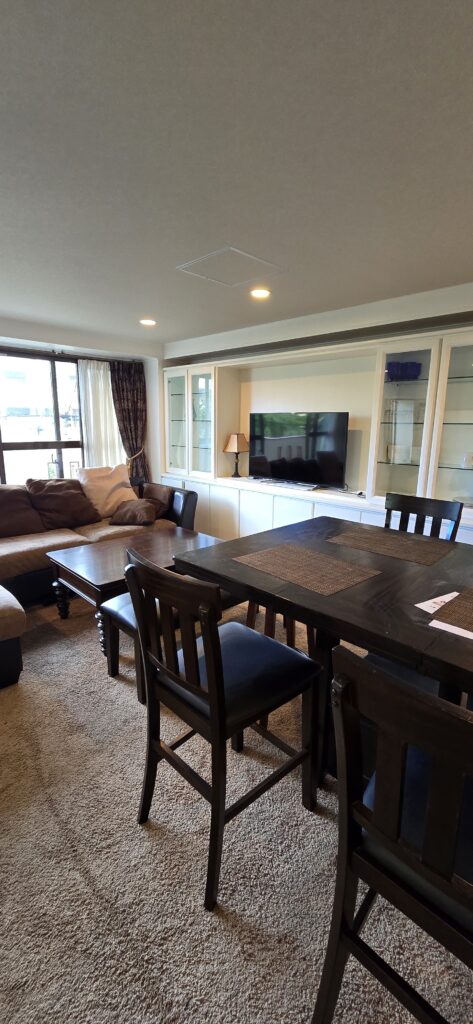 Modern, furnished interiors with TV, bath & shower, in-room washer & dryer, living room and dining room.